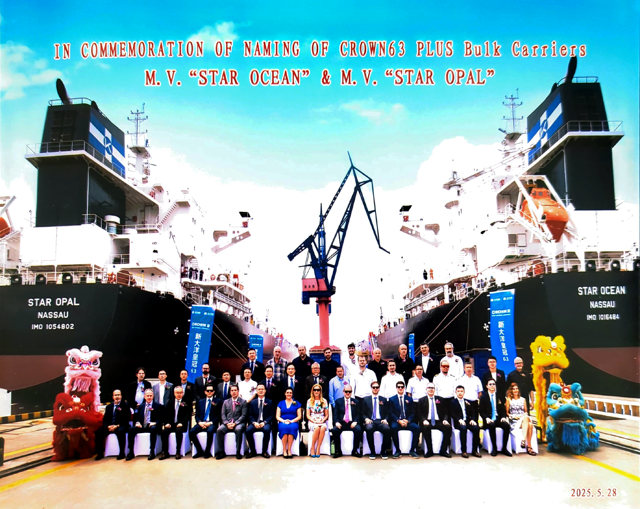 Chartworld Shipping Christens Two New Bahamian-Flagged Vessels Category BMA News Date Posted 19 June 2025 Share Facebook Twitter LinkedIn The Bahamas Maritime Authority (BMA) was pleased to take part in the christening of two new vessels – STAR OCEAN and STAR OPAL – ordered by Chartworld Shipping Corporation from New Dayang Shipbuilding Co., Ltd. (Jiangsu), which is a subsidiary of SUMEC Marine Co., Ltd. in Nanjing. Held on 28 May 2025, the ceremony was attended by BMA’s Japan Director, Mr. Hitoshi Matsumoto, along with Chartworld executives including members of the Kollakis family (Ilias, Luke and Stefanos) and Chartworld Managing Director, Mr. Antonios Faraklas, who is also a Bahamas Shipowners Association Board member. A pre-ceremony gathering took place the day before. Chartworld continues to maintain a strong fleet under the Bahamian flag, and the BMA remains committed to providing excellent service and support.